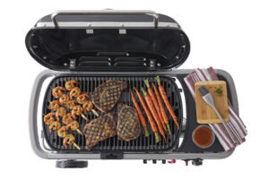 – Le gril est fixé au chariot, ce qui vous permet de griller en un rien de temps.