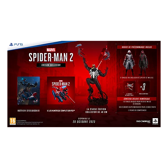 Obtenez le pack console PlayStation 5 – Marvel’s Spider-Man 2 Édition limitée aux couleurs du symbiote envahisseur tiré du jeu, et plongez-vous dans le nouveau jeu de la franchise Marvel’s Spider-Man. Ce pack inclut une console PS5 avec des façades pour console Édition limitée, une manette sans fil DualSense Édition limitée, un code de téléchargement pour la version numérique du jeu, ainsi que des bonus de précommande.